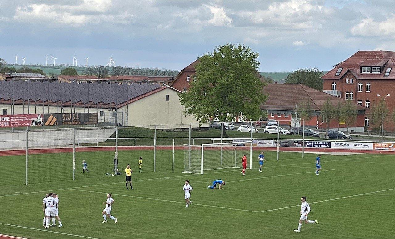 Die Preußen in weiß jubeln nach dem Führungstreffer, die blau gekleideten Nordhäuser lassen die Köpfe hängen. (Foto: oas)