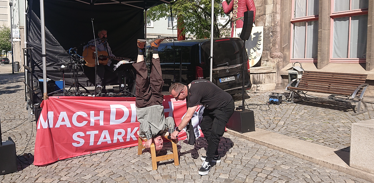 Auf das Ergebnis könne man nicht recht Stolz sein, sagte Juliane Schinkel, die Kreisvorsitzende der Nordhäuser Genossen, es gebe zu viele Punkte, bei denen nach unten getreten werde. Dennoch müsse man sich den Zusammenhalt in den eigenen Reihen erhalten, es müsse kritische Stimmen in der Partei geben, wenn man wieder zu sozialeren Positionen kommen wolle. Für stellt man sich bei der Nordhäuser SPD traditionell auch auf den Kopf: Siegfried Junker, 86 Jahre jung und seit 1953 in der Gewerkschaft, lies es sich nicht nehmen, sein kleines Kunststück auch an diesem 1. Mai vorzuführen.