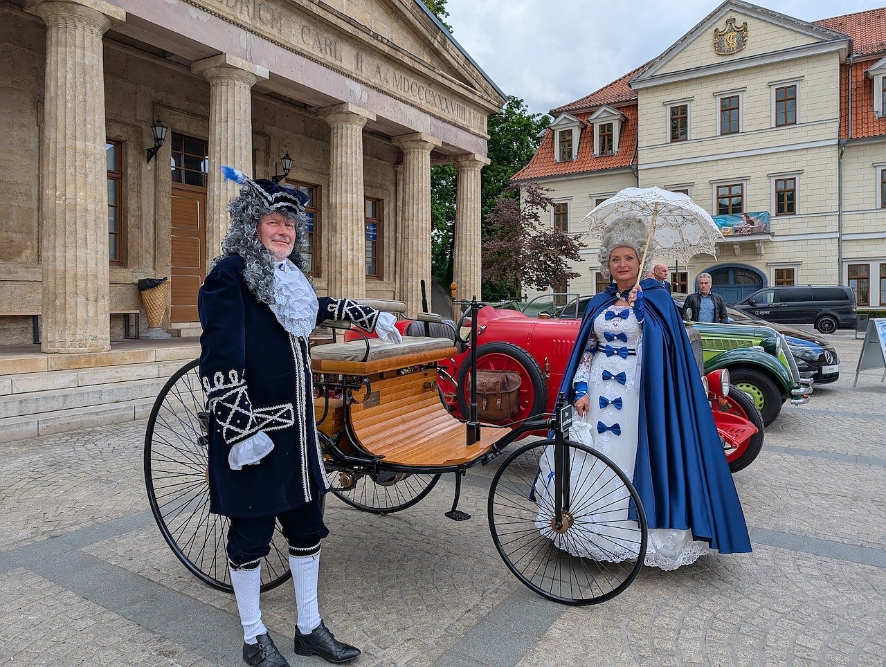 Das aktuellste Gefährt zeigte Melanie Kunze mit dem vollelektrischen Mercedes EQS mit 560 PS, der im Vergleich zum einstigen Dreirad die eindrucksvolle Fahrzeuggeschichte der vergangenen Jahrhunderte in Sondershausen demonstriert.