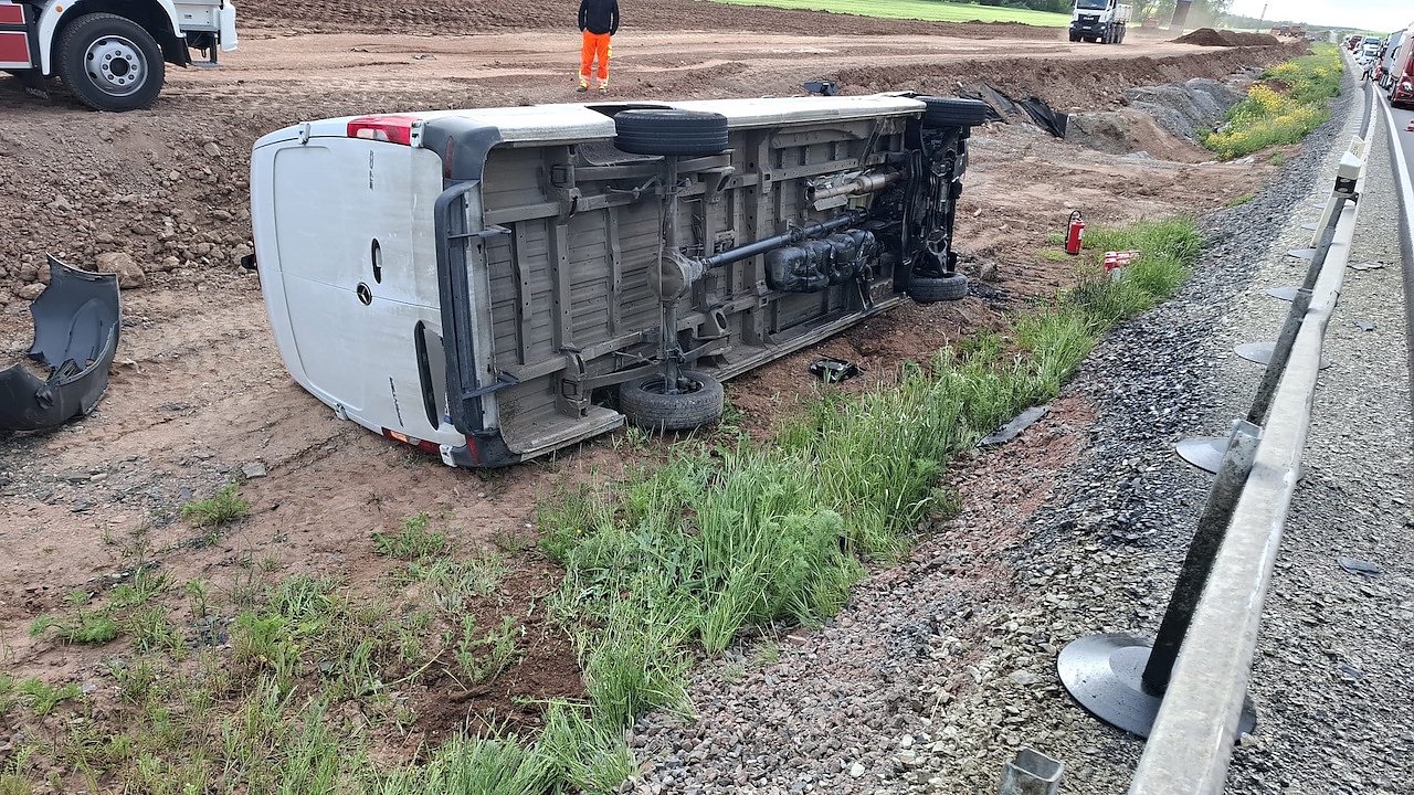 Zeitgleich beabsichtigte der Fahrer des Lastkraftwagens zum Überholen eines anderen Fahrzeugs anzusetzen. Hierbei kam es zur Kollision beider in Bewegung befindlichen Verkehrsteilnehmer. Der Fahrer des Sprinters kam neben der Fahrbahn auf der Seite zum Liegen und verletzte sich leicht. Der Transporter wurde durch einen Abschleppdienst geborgen.