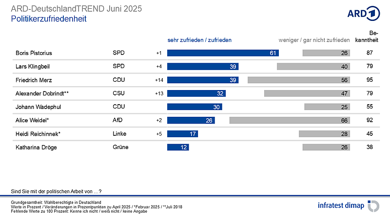 Die Spitzen der Bundestagsopposition tun sich im Urteil der Wahlberechtigten schwer. Die neu berufenen Fraktionsvorsitzenden der Grünen und Linken, Dröge und Reichinnek, kämpfen mit Bekanntheitsproblemen. Solche kennt AfD-Fraktionschefin Weidel nicht. Sie überzeugt gut jeden vierten Wahlberechtigten, zieht aber zugleich die größte Abneigung auf sich.