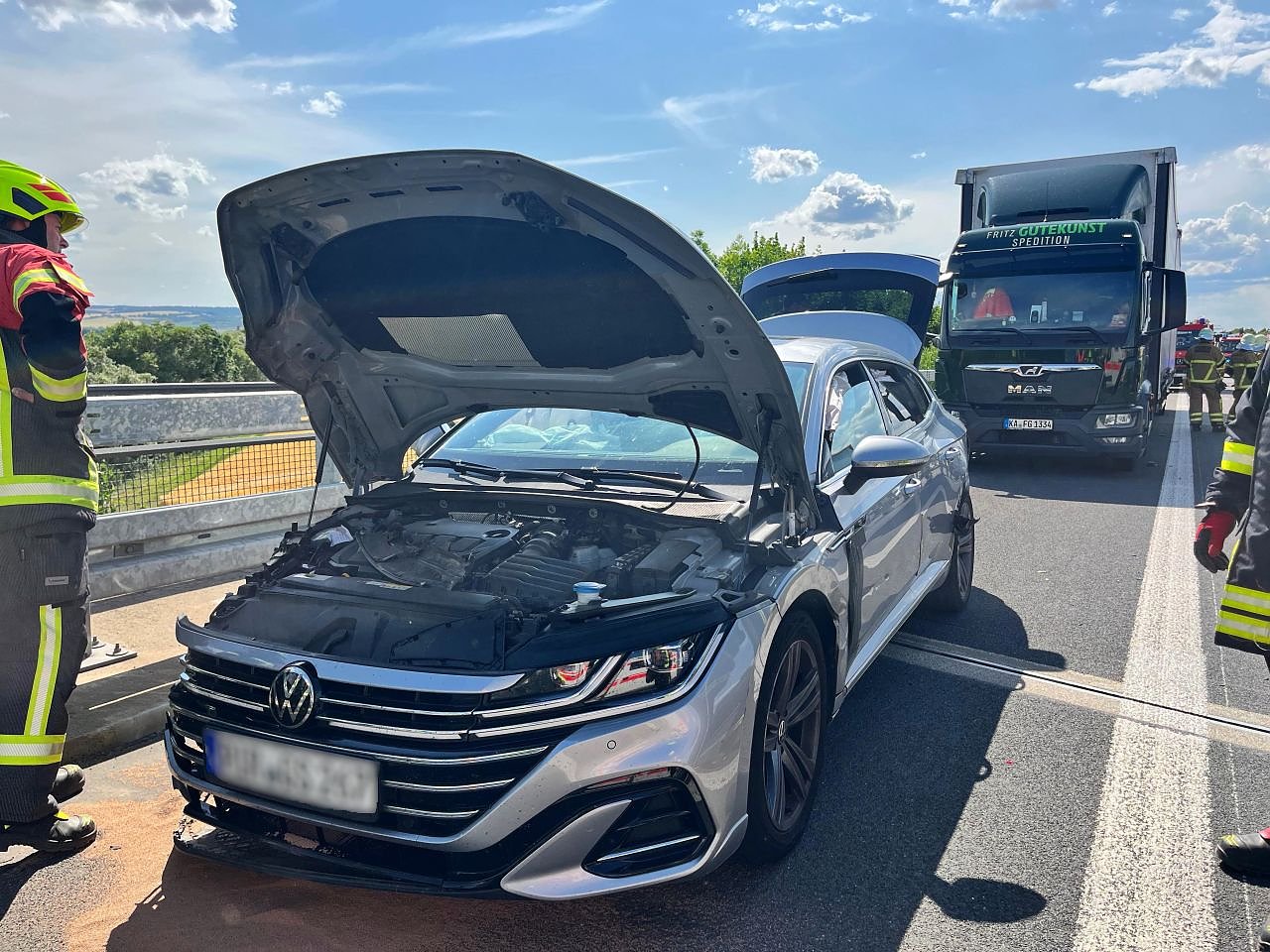 Der 64-jährige VW Fahrer sowie die 41-jährige Beifahrerin wurden bei dem Unfall leicht verletzt. Die Schadenshöhe wird mit 20.000,- beziffert. Für die Zeit des Einsatzes von Feuerwehr und Rettungsdienst wurde die Autobahn in Fahrtrichtung Leipzig kurzzeitig voll gesperrt.