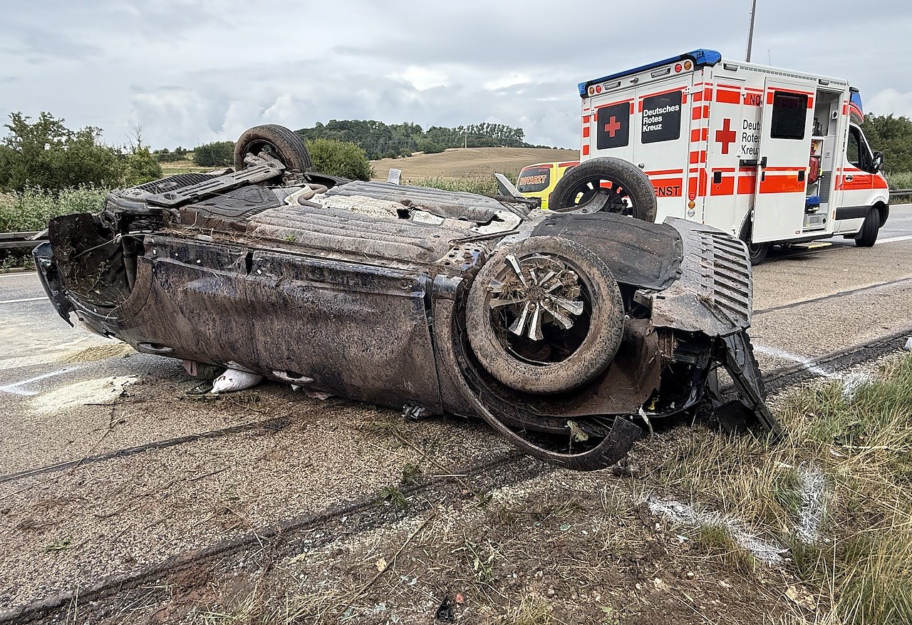 Bei Starkregen zwischen Worbis und Nordhausen kam der 47-jährige Fahrer auf Höhe des Rastplatz Galgenberg nach rechts vor der Fahrbahn ab, der Wagen prallte in die Böschung, überschlug sich dort und kam auf dem Dach liegend auf dem Standstreifen zu stehen.