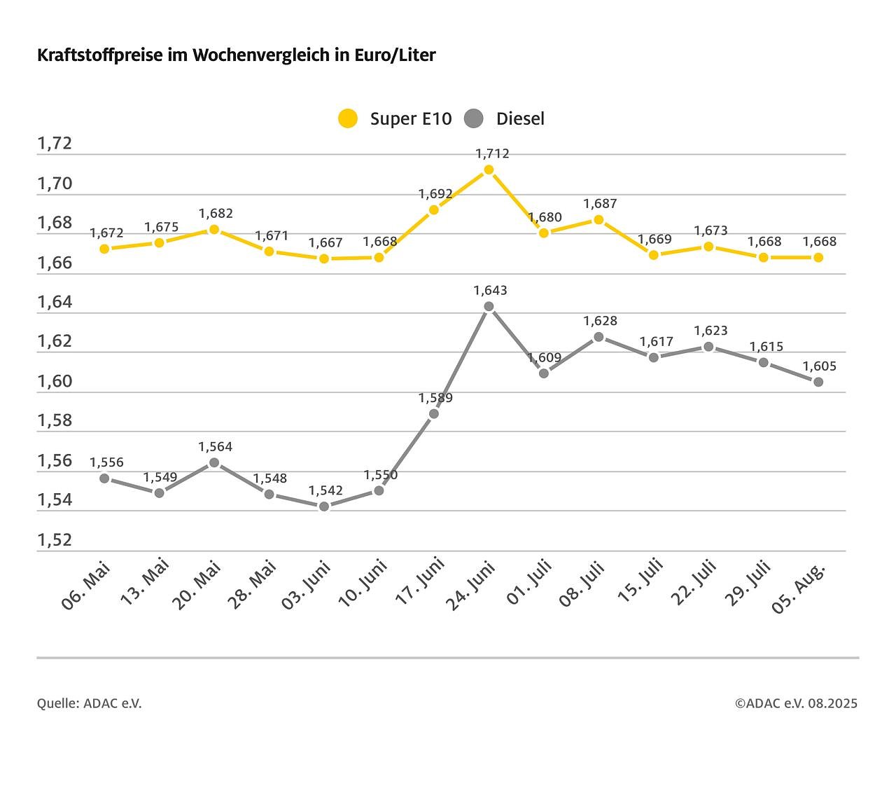 Unverändert ist hingegen der Benzinpreis: Ein Liter Super E10 kostet wie vor einer Woche 1,668 Euro. Deutlich gesunken ist im selben Zeitraum jedoch der Ölpreis. Lag Brent-Öl vor Wochenfrist noch bei einem Preis von über 72 US-Dollar je Barrel, rutschte er zuletzt um gut vier Dollar auf rund 68 US-Dollar ab.