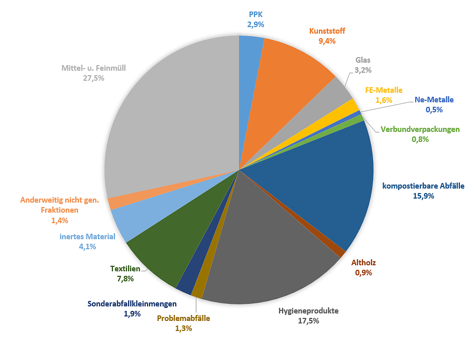 Die Hausmüllanalyse zeigt, dass das durchschnittliche Hausmüllaufkommen im Landkreis Nordhausen bei etwa 134 Kilogramm pro Einwohner liegt. Dieser Wert ist niedriger als der nationale Durchschnitt von 151 Kilogramm und auch niedriger als der Wert aus der Hausmüllanalyse 2016 mit 145 Kilogramm pro Einwohner im Jahr. Ein weiteres Ergebnis ist, dass wesentliche Bestandteile des Hausmülls mit rund 18 % Hygieneprodukte, mit 16 % kompostierbare Abfälle und mit ca. 9 % Kunststoffe sind.