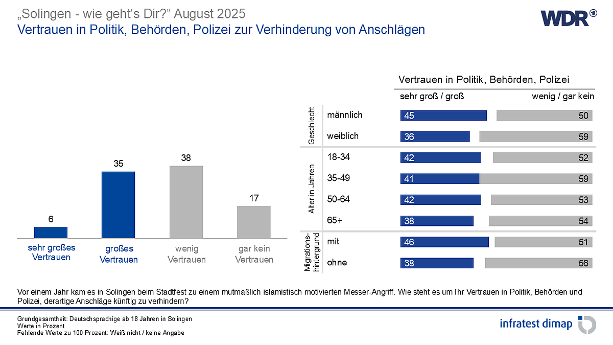 Dass Anschläge wie der vom August letzten Jahres künftig verhindert werden können, trauen vier von zehn Solingern (41 Prozent) Politik, Behörden und Polizei zu. Bei über der Hälfte von ihnen (55 Prozent) aber ist das Zutrauen gering.