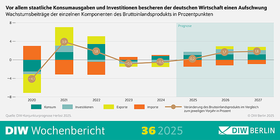 Für 2025 revidiert das DIW Berlin seine vorherige Prognose ein wenig nach unten. Die erste Jahreshälfte verlief holprig – nach einem schwungvollen Start, der aber vor allem an vorgezogenen Exporten angesichts der drohenden US-Zölle lag, ging es gleich wieder bergab. In den kommenden Jahren dürften die öffentlichen Mehrausgaben immer stärker ihre Wirkung entfalten: 2026 wird sich das Wachstum wie bereits in der Sommerprognose erwartet wohl deutlich beschleunigen. Für 2027 wird ein Plus in ähnlicher Größenordnung prognostiziert.