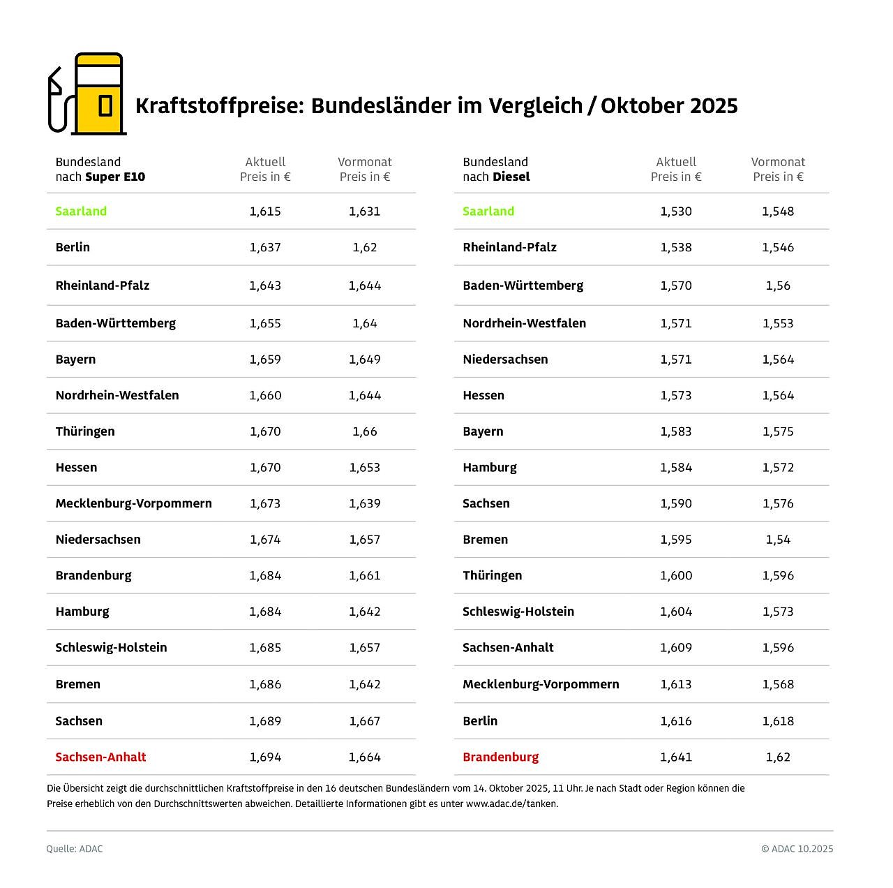 Für die heutige Untersuchung hat der ADAC die Preisdaten von mehr als 14.000 bei der Markttransparenzstelle für Kraftstoffe erfassten Tankstellen ausgewertet und den 16 Bundesländern zugeordnet. Die ermittelten Preise stellen eine Momentaufnahme vom 14. Oktober 2025, 11:05 Uhr, dar.