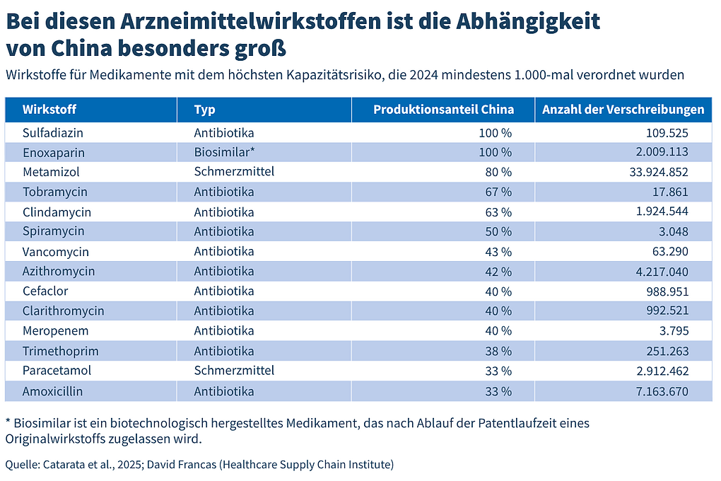 Bei 20 der 56 untersuchten versorgungsrelevanten Wirkstoffen besteht ein hohes Kapazitätsrisiko – das heißt, mindestens ein Drittel der gesamten Produktionskapazitäten würde bei einem chinesischen Lieferstopp potenziell wegfallen. Käme es so weit, könnten hierzulande jährlich bis zu 42 Millionen Packungseinheiten wegfallen.