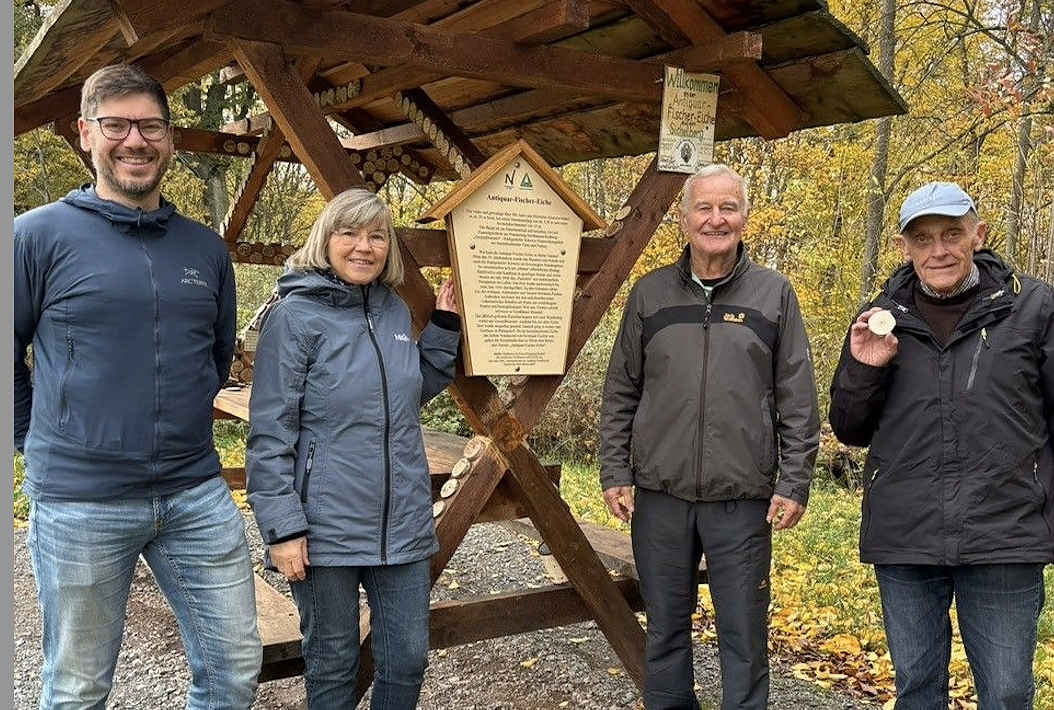 Rüdigsdorfer Schweiz, einem Naturschutzgebiet mit beeindruckender Flora und Fauna. Historische Bezüge zur Antiquar-Fischer-Eiche sind auf dem Informationsschild an der 25 m entfernten Waldschänke genauer erläutert. Die Waldschänke wurde übrigens im Jahr 2022 von Herrn Fiedler anlässlich seines runden