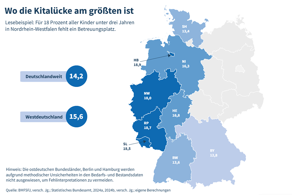 Anders ist die Lage im Osten: Hier ist die Zahl der unter Dreijährigen seit 2019 mit einem Rückgang um fast 20 Prozent regelrecht eingebrochen. Damit ist auch der Bedarf an Betreuungsplätzen von 261.000 (2019) auf 213.000 (2025) gesunken. Rein rechnerisch ergibt sich daraus immer noch eine Lücke von 25.000. Allerdings dürfte der tatsächliche Bedarf deutlich geringer ausfallen, was mit Unschärfen in der Statistik zusammenhängt.