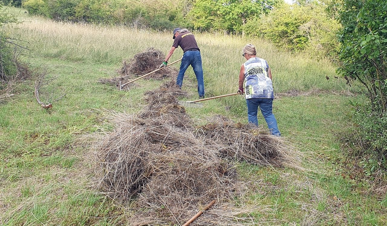 Mähen und Harken gehört zu den häufigsten Maßnahmen bei ehrenamtlichen Artenschutzeinsätzen, hier in der Nähe von Bleicherode. (Foto: B. Schwarzberg)