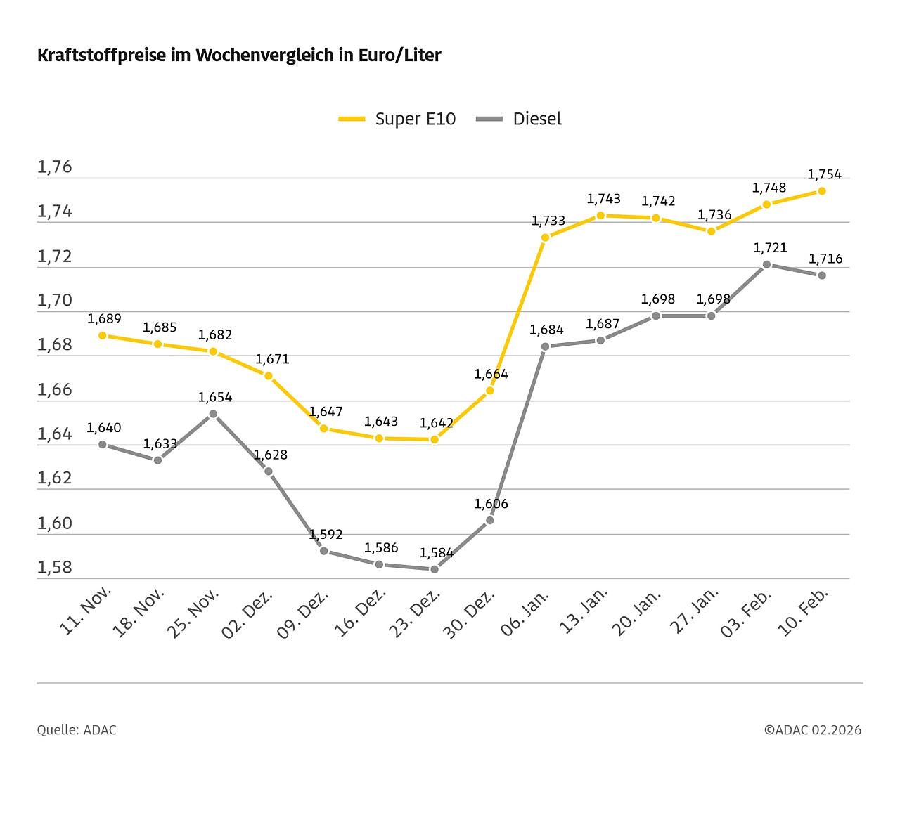 Autor: redLaut aktueller ADAC Auswertung der Kraftstoffpreise kostet ein Liter Super E10 im bundesweiten Schnitt derzeit 1,754 Euro und damit 0,6 Cent mehr als in der Vorwoche. Die entgegengesetzte Richtung hat der Dieselpreis eingeschlagen, der um 0,5 Cent auf 1,716 Euro gesunken ist.