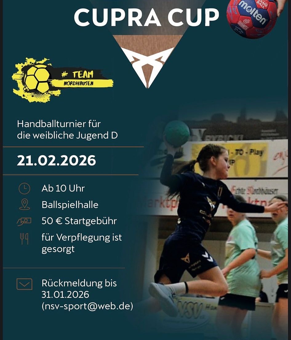 Am Samstag, 21. Februar, wird die Ballspielhalle in Nordhausen zum Schauplatz eines großen Handball-Nachwuchsturniers: Der Nordhäuser SV richtet den Cupra-Cup für die weibliche Jugend D aus...Von 10 bis 17 Uhr kämpfen acht Mannschaften aus vier Bundesländern um Tore, Punkte und Pokale. Mit dabei sind der Nordhäuser SV, HC Burgenland, SG MoGoNo Leipzig, SV Union Halle-Neustadt, HC Leipzig, TV Jahn Duderstadt und SC Markranstädt. SV Union Halle-Neustadt tritt mit zwei Teams an, sodass trotz sieben aufgeführter Vereine insgesamt acht Mannschaften am Start sind.