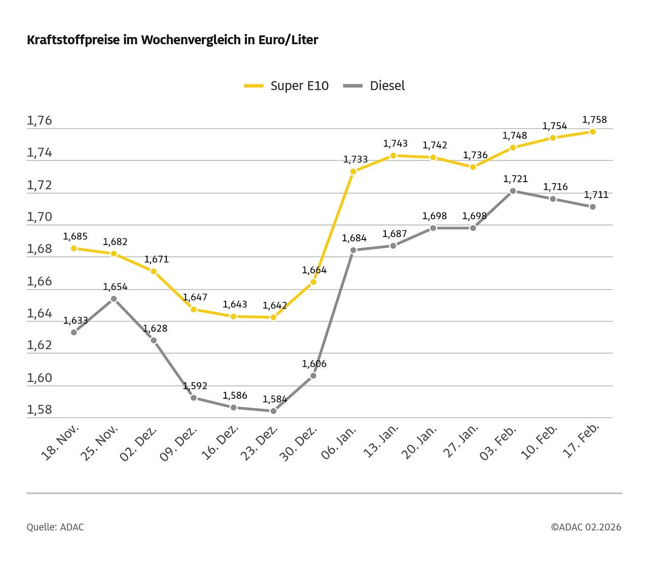 Autor: redLaut aktueller ADAC Auswertung kostet ein Liter Super E10 im bundesweiten Mittel derzeit 1,758 Euro und damit 0,4 Cent mehr als vor Wochenfrist. Diesel ist um 0,5 Cent günstiger und kostet zurzeit im Schnitt 1,711 Euro.