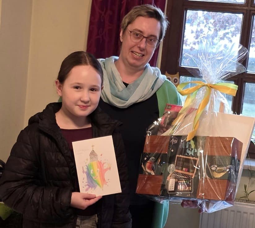 Am Ende überzeugte der Entwurf der zehnjährigen Clara Nowak. Ihre Idee eines bunten Farbkleckses greift die Vielfalt der Kunst-Workshops auf und stellt zugleich eine Verbindung zur Kirche her. Ich habe einen bunten Farbklecks gemalt, weil die Kunst Workshops immer etwas mit Farbe zu tun haben, vielfältig und bunt sind und mir war wichtig, dass man unsere Kirche darauf erkennt, erklärt Clara Nowak.