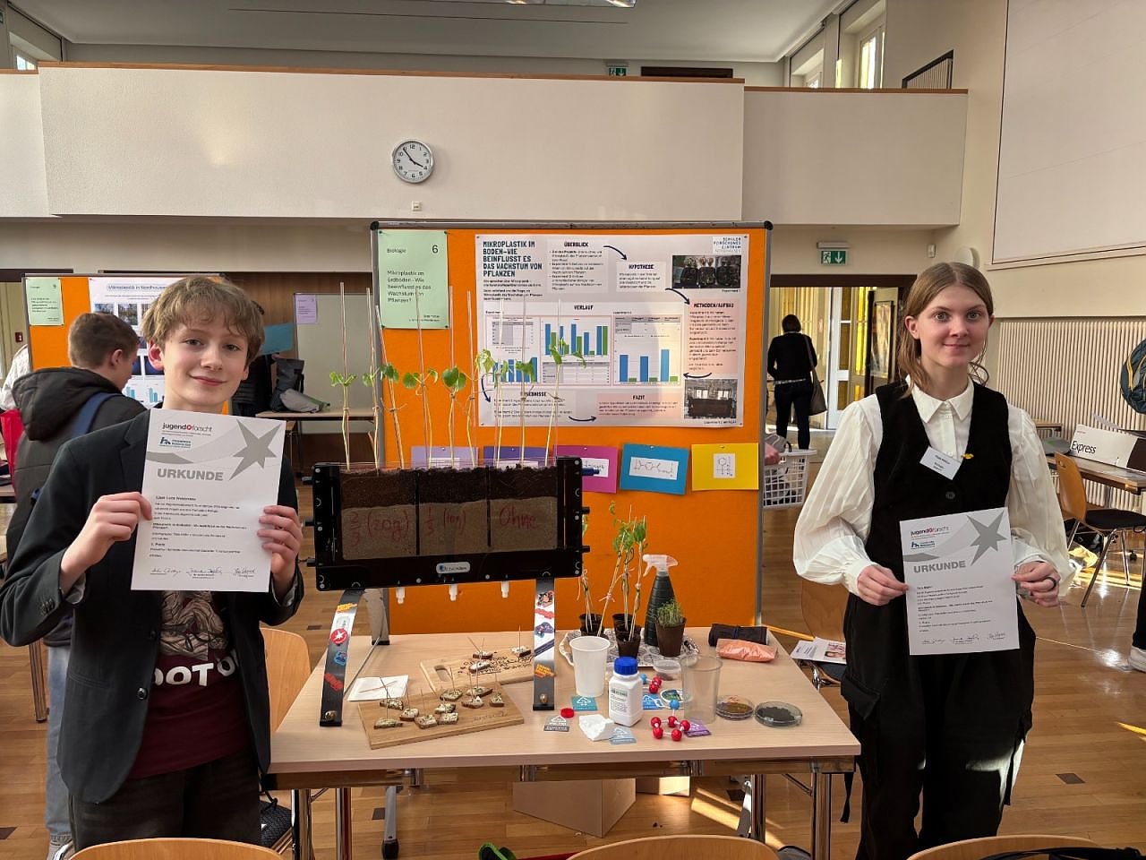 So haben sich Tilda Müller und Liam Luca Weidensee (7a) mit dem Thema Mikroplastik im Erdboden – Wie beeinflusst es das Wachstum von Pflanzen? befasst.