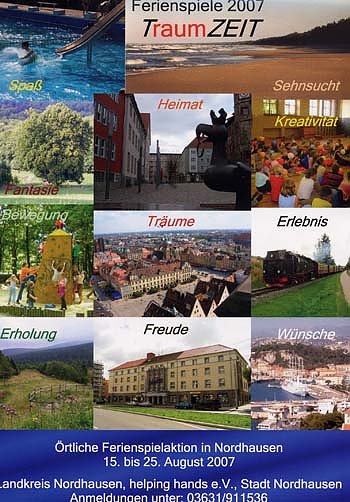 Für Kinder und Jugendliche heißt das, vom 15. bis 25. August 2007 ihrer Kreativität freien Lauf zu lassen und sich in eine neue Erlebniswelt zu begeben. Dabei widmen sie sich mit Gruppenleitern Projekten, die zur persönlichen Entfaltung beitragen sollen. Außerdem stehen einige Tagesausflüge für die Teilnehmer der Ferienfestspiele an. Hier soll die Verbindung von Wissenserwerb, Erholung und Erlebnis die Kinder und Jugendlichen aktiv werden lassen. Der Höhepunkt der Ferienspielaktion wird aber wie immer das große Abschlussfest sein, wo die Kinder und Jugendlichen ihre Erlebnisse und Projekte vorstellen können. Die Initiatoren der örtlichen Ferienspielaktion, wie der Landkreis Nordhausen, helping hands e.V. und die Stadt Nordhausen hoffen auf großes Interesse an den Ferienfreizeiten. Anmeldungen zu den Ferienspielen können ab dem 4. Juni in der Behringstr. 3, 99734 Nordhausen im Zimmer 159 erfolgen. Aufgrund der täglichen Mittagsverpflegung und der Betreuung der Teilnehmer durch die Gruppenleiter, in der Zeit von 9.00 Uhr bis 16.30 Uhr wird voraussichtlich ein Kostenbeitrag in der Höhe von sechs Euro pro Tag erhoben.
