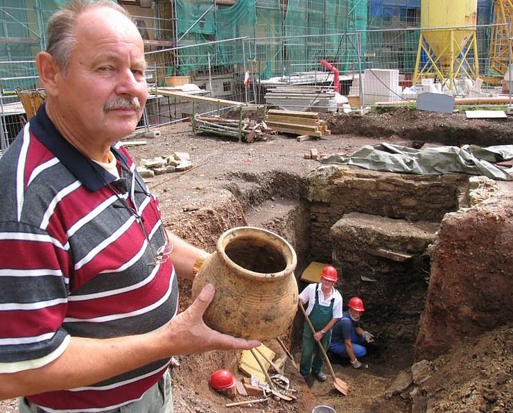 Autor: nnzWolfgang Müller vor der ausgegrabenen Latrine mit dem wegen seiner Form so bezeichneten Bombentopf aus dem 13. Jahrhundert