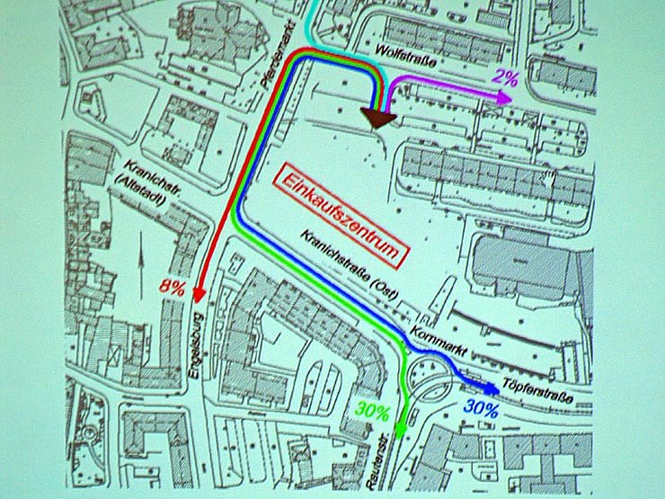 Letzterer ist bewußt nicht gewollt im so genannten Altstadt Forum. Vielmehr sollen Ladeflächen nicht unter 600 Quadratmeter angeboten werden. Der kleinteilige Handel solle sich um das neue Zentrum herum etablieren.