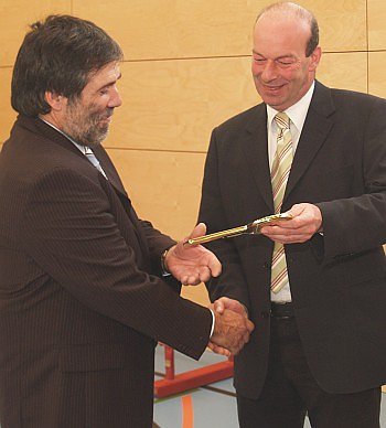 Der goldene Schlüssel wurde denn auch über mehrere Stationen weitergereicht. Vom Architekt zu Landrat Joachim Claus (CDU), dann zum Schulleiter Helmut Herndrich und der gab das Teil weiter an die Sportlehrerin Renate Ostwald. Schulleiter Herndrich bedankte sich beim Kreistag, den Fachämtern der Verwaltung, bei den Planer und Baufirmen und wünschte sich, daß auch die Außenanlagen nicht vergessen werden.
