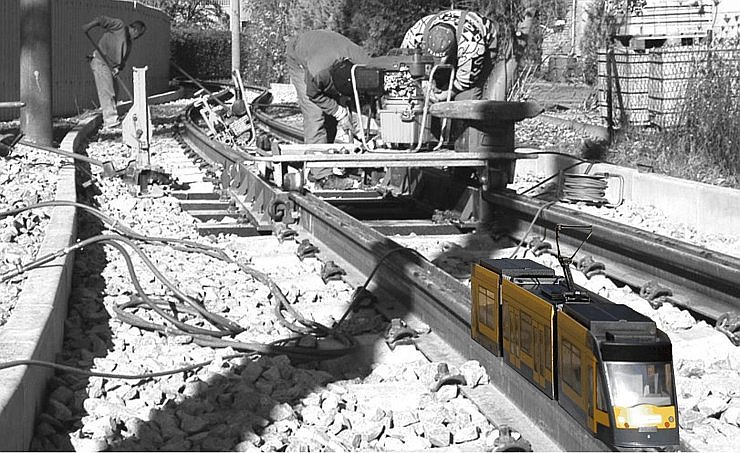 Das herbstliche Wetter Anfang der Woche spornte nicht nur die Arbeiter der bauausführenden Firmen an, die Neuverlegung und Einbettung der Gleise im Haltestellenbereich Behringstraße voranzutreiben. Bei Sonnenschein hatte sich eine Miniaturausgabe des Combino Duo schon mal zur Probefahrt auf’s neue Gleis gewagt.
