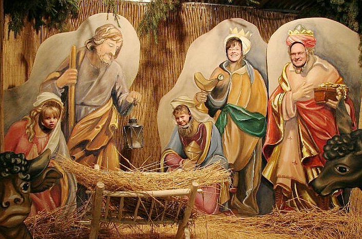 Die Krippe steht neben dem Theatereingang und ist täglich immer parallel zum Theater - Adventskalender von 17.00 - 18.00 Uhr geöffnet. Die Gesichter von Maria und Joseph, den 3 Königen aus dem Morgenland und der Hirten sind herausnehmbar, so das die Besucher den Figuren kurzzeitig ihr eigenes Gesicht leihen können.