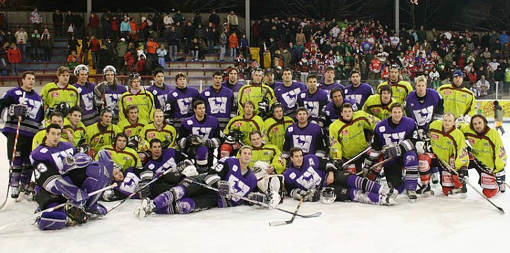 Auf dem Eis noch Gegner, nach dem Spiel aber vereint: Die Mannschaft der Harzer Wölfe mit ihren kanadischen Gästen von der University of Western Ontario