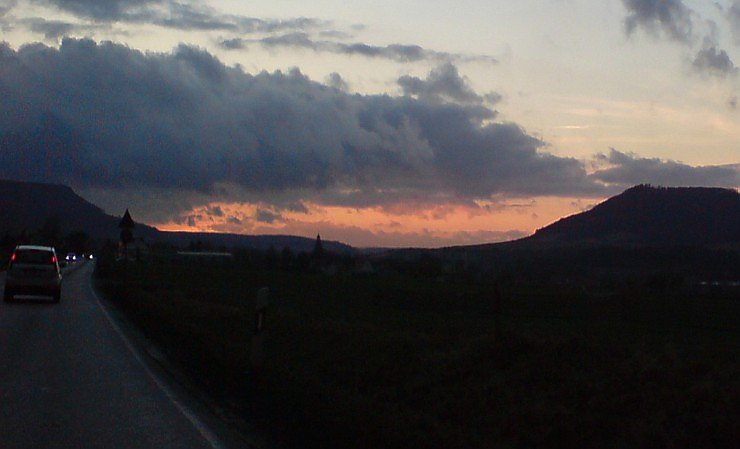 Diese Bild dokumentiert den Sonnenuntergang über der Eichsfelder Pforte aus Richtung Gebra, aufgenommen auf der B 80 am 1. Februar 2007