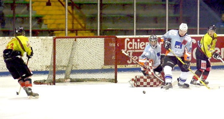 Autor: nnzDas Tor verwaist, der Puck wird aber nicht den Weg hinein finden. ESC-Stürmer Andreas Bippus sowie die Timmendorfer Matthias Koglin und Björn Reinke (von rechts) können dem Puck unr hinterherschauen. Stephan Hiendlmeyer (links) kann die Gunst der Stunde aber nicht nutzen