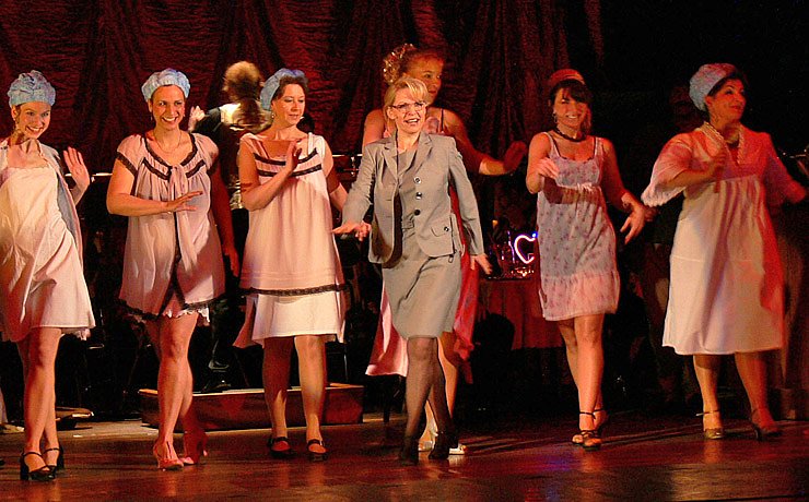 Zwischen den musikalischen Genußstücken gab es auf der erweiterten Bühne im Großen Haus die eine oder andere Showeinlage. Punkt 0.00 Uhr trat eine etwas seltsame Truppe auf die Bretter. Boney M. in persona von Ballettdirektorin Jutta Wörne, Oberspielleiterin Kerstin Weiß, Intendant Lars Tietje sowie Verwaltungsdirektor Wolfgang Schwerdtfeger ließen es so richtig krachen, schwitzten unter Kostümen und Perücken, verzückten mit diversen Verzuckungen das Publikum und waren überglücklich, als sie sich – normal ballgekleidet – wieder unters Feiervolk mischen konnten.