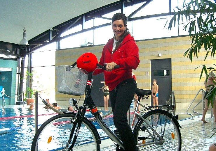 Sandra Wernsdorf präsentiert die Osterüberraschung im Badehaus. Dieses schicke City- Bike aus Aluminium können alle Gäste des Badehauses durch die Zusammenarbeit mit dem Fahrrad-Direktshop in der Freiherr-vom-Stein-Straße in den nächsten Wochen bei einer Verlosungsaktion gewinnen.