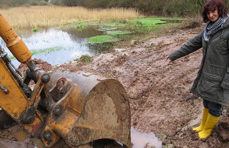 Derzeit fließe aufgrund des schadhaften alten Dammes zu viel Wasser aus den Teichen ab. Der neue Damm werde aus Lehm gefertigt - und nach seiner Fertigstellung wird der Wasserstand um etwa 2 Meter höher sein als zuvor. Zugleich wird damit der Schilfbewuchs zurückgedrängt, der ebenfalls dazu führte, dass sich der Wasserstand immer weiter verringerte, weil sich die verfaulten Schilfpflanzen als Sediment auf dem Grund des Teiches ablagerten, so Frau Windisch.