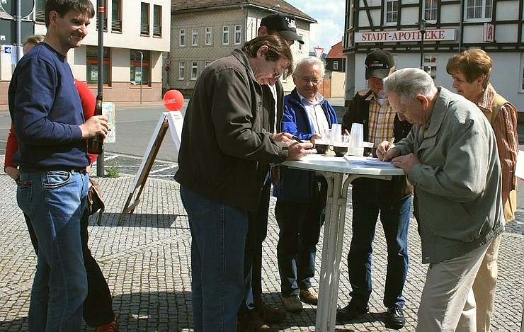 Mit einem Informationsstand auf dem Ellricher Marktplatz hat die Basisorganisation der Linken Anfang Mai Unterschriften für das Volksbegehren "Mehr Demokratie in Thüringer Kommunen" gesammelt. Rolf Wille war für die nnz dabei...