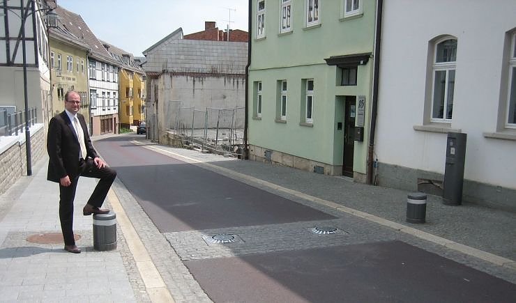 Bürgermeister Jendricke in Sondershausen an einer Zufahrtsstraße zur dortigen Fußgängerzone. Dort habe man gute Erfahrungen mit den ausfahrbaren Pollern gemacht, die auch hier nachts ausgefahren werden