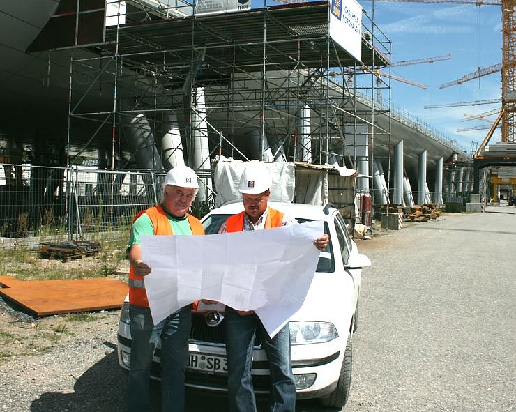 Autor: nnzRichtmeister Manfred Reibling (links) und Bauleiter Andreas Hentrich vor dem Arirail-Center am Frankfurter Flughafen