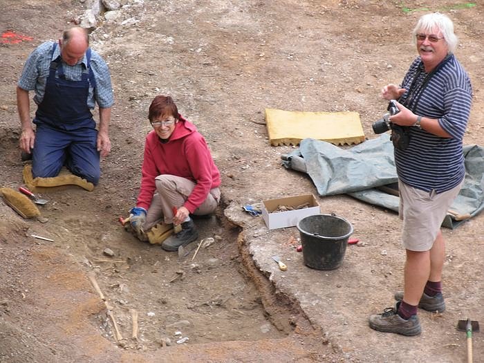 Gestern begannen die archäologischen Untersuchungen hinter dem Nordhäuser Rathaus. Genau dort, wo eine Tiefgarage und ein Ratssitzungssaal ihre neue Heimstatt haben werden. Und gleich am ersten Tag stießen die Mitarbeiter um Peter Sukalla (unteres Foto rechts) vom Landesamt für Archäologie in Weimar auf menschliche Überreste. Nach Informationen der nnz stammen die Knochen von einem alten Friedhof, der einst im Zentrum von Nordhausen angelegt worden war.