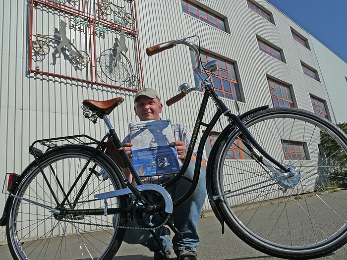Zweitens: Die Nostalgie. André Kegel und seine beiden Messe-Mitstreiter haben viele Kontakte knüpfen können, konkrete Absprachen gab es mit Händlern aus England, Ungarn, Norwegen, Spanien, Finnland, ja sogar aus Korea. Für diese Händler, wie für die in Deutschland sind Kleinserienfertigungen von 1.500 bis 2.000 Stück interessant. Im Fokus des Interesses der deutschen Händler stand überraschenderweise das Nostalgierad, dem Manfred Handke den Namen Blechelse verpaßte. Schwarzer gemuffter Rahmen, Ledersattel, eine Ledertasche für nötigstes Reparaturzeug unter dem Sattel, goldener Schriftzug und lederne Handgriffe am Lenker. Für diese Retrodesign, dessen wichtigste Teile in der Nähe von Eisenach und nicht in Taiwan hergestellt werden, war das Interesse überwältigend, beschreibt es André Kegel.