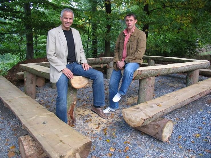 Umweltsamtsleiter Steffen Meyer (links) und Stadtförster Axel Axt auf dem neuen Rastplatz am Haselhai, der im Zuge der Wegesanierung entstanden ist