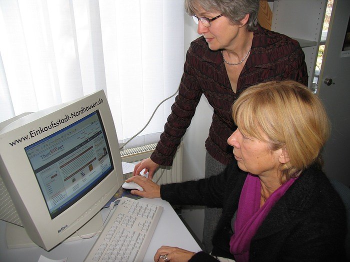 Autor: nnzOberbürgermeisterin Barbara Rinke (vorn) startet in der Bibliothek gemeinsam mit deren Leiterin, Kersti Kramer, symbolisch das Angebot des Thuebibnet