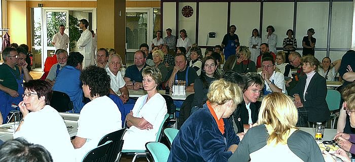 Die Betriebsratsvorsitzende der Einrichtung, Andrea Schnell, freute sich über einen vollen Speisesaal. Viele Mitarbeiter waren gekommen, um sich mit dem Aktionsbündnis zur Rettung der Krankenhäuser solidarisch zu zeigen.
