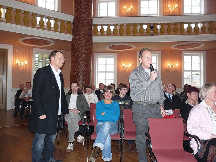 Nach anfänglichem Zögern, weil alle hier" riefen, kam Stadtrat Hartmut Thiele (CDU) auch gleich mit einer brisanten Frage. Er stellte fest, dass es z. B. beim ökumenischen Chor, der heute beim Pontifikalamt sang, und anderen Aktionen eine gute Zusammenarbeit von Protestanten und Katholiken gab und gibt, und fragte den Kardinal, warum es in den oberen Kirchenkreisen kaum eine ähnliche Zusammenarbeit gäbe.