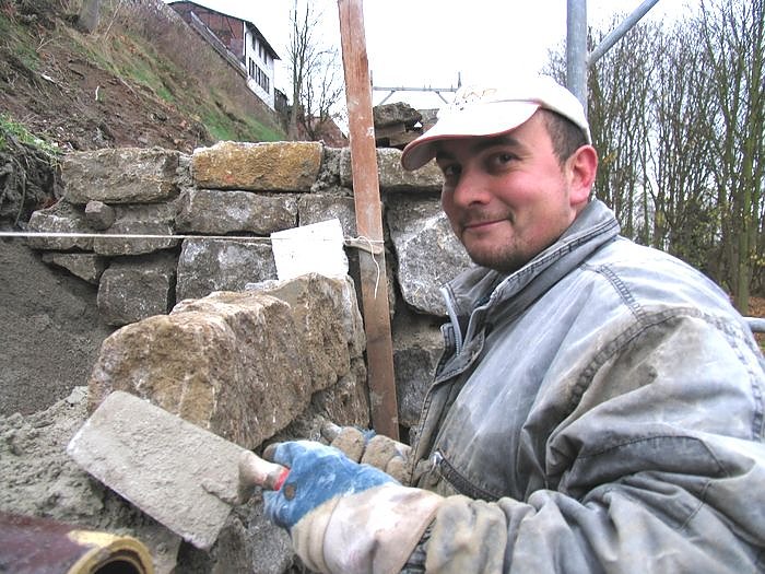 Sven Wehrhan bringt die Verblendungssteine an