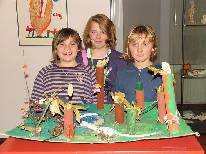 Marie, Annabelle und Laura vor der Gemeinschaftsarbeit Urwald der 4. Klassen der GS A. Kuntz
