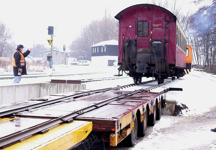 Am gestrigen Nachmittag wurde mit dem 900-211 nun bereits der erste HSB-Reisezugwagen über die nagelneue Rampe auf einen LKW verladen. Das 78-jährige Fahrzeug, welches nach Einsätzen in Sachsen und im Spreewald seit 1970 auf den Harzer Schmalspurgleisen unterwegs ist, wird in den nächsten Wochen einer gründlichen Hauptuntersuchung bei der Leipziger Firma IFTEC unterzogen. Mit Unterstützung der Rangierlokomotive 199 011 wurde das ca. 15 Tonnen schwere sowie rund 15 Meter lange Gefährt sanft und ruckfrei auf den bereitstehenden Tieflader geschoben und konnte anschließend die Reise nach Sachsen antreten.