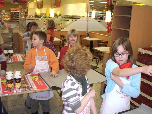 Am 17.12.08, um 15 Uhr trafen wir an den gut vorbereiteten Tischen vor dem Backstand ein. Die Bleche, der Teig, die Ausstechformen und alles Zubehör standen für uns bereit. Jeder bekam eine Schürze um und die Aufregung war groß! Schon konnte es losgehen. Fleißig und geschwind wie die Heinzelmännchen verwandelten wir den Teig in fantasievolle Plätzchen.