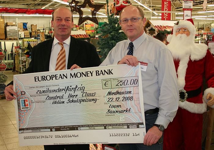 Autor: nnztoom-Marktleiter Peter Panse übergibt Landrat Claus den Scheck. Damit wird der Landkreis die Schulspeisung unterstützen