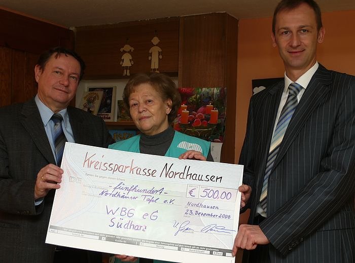 Der Vorstand der Wohnungsbaugenossenschaft Südharz eG. hat heute einen Scheck in Höhe von 500 Euro an die Leiterin der Nordhäuser Tafel, Helga Rathnau, übergeben. Damit will die größte Wohnungsbaugenossenschaft im Norden Thüringens die ehrenamtliche Arbeit der vielen fleißigen Helfer der Nordhäuser Tafel weiter unterstützen. Neben dem symbolischen Scheck überreichten Hans-Werner Grimm und Sven Dörmann auch den richtigen Scheck.