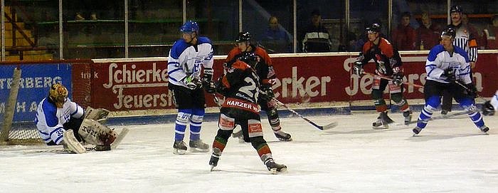 Gegen die sehr defensiv agierenden Langenhagener, übrigens ohne Ex-Nationalspieler Len Soccio angetreten, taten sich die Wölfe lange schwer. Trotz einiger Chancen während einer fast fünfminütigen Überzahl zu Beginn gingen die Gäste anschließend mit ihrem ersten Konter in Führung. Rene Zitzer war gerade von der Strafbank gekommen, als er mit einem satten Schuss Wölfe-Goalie Tobias Bannach überwand (8.). Im Anschluss scheiterten die Harzer immer wieder am starken Langenhagener Torwart Mark Röhrig, so dass es mit einem Rückstand in die erste Drittelpause ging.