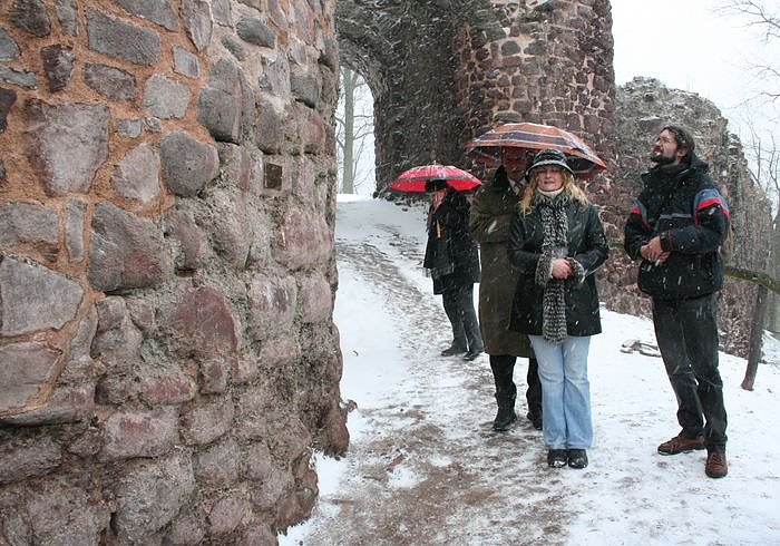 Noch ist nur ein kurzer Teil der etwa 1,70 Meter dicken Mauer mit gesammelten Originalsteinen unterhalb des Kammertors wieder aufgebaut. Aber es ist ein erster wichtiger Schritt, der die Kontur der Burg weiter sichtbar werden lässt. Trotz des dichten Schneefalls sind rund 25 Leute, darunter Vertreter der Verwaltungsgemeinschaft, der Gemeinde Hermannsacker, des Landkreises und natürlich des Vereins für lebendiges Mittelalter, der sich seit einigen Jahren um die Erhaltung und Pflege der Burg kümmert, zur Einweihung gekommen und haben die neue Mauer auf Einladung des Vereins gefeiert – mit Sekt und Spanferkel.